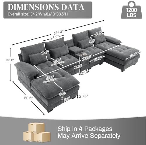 【Easy Assembly Grey Sectional Couch】Overall size:134.2″W x 60.6″D x 33.5″H. This grey sectional sofa is easy to assembly and tools are all included. Included components: Instruction manual. If you have any questions, please feel free to contact us, we will reply you as soon as possible