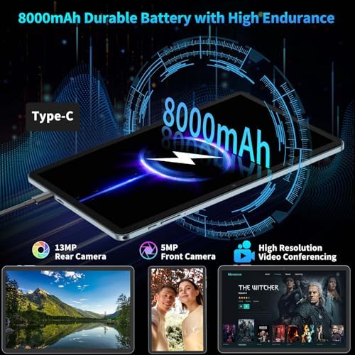 【8000 mAh Battery & Dual Cameras】The 8000mAh battery with USB Type-C ensures long-lasting use of the tablet, making it suitable for traveling, commuting and outdoor activities.The 5MP front camera and 13MP rear camera can meet your daily photography and video call needs. You can also use it to take videos and record your daily life