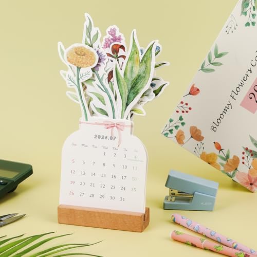 Unique Design — The small Desk Calendar is designed with 12 different Bloomy Flowers patterns and a wooden stand, looks pleasant to the eye and the packaging is Visually appealing