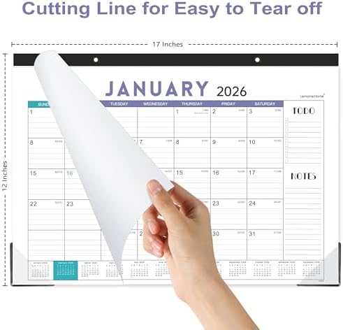 Jan 2026 – Dec 2026 monthly desk/wall calendar.Pages size: 17″ x 12″. Perfect to occupy your desk or your wall.Julian dates + marked holidays (federal holidays bolded) ensure you never skip a key event.Dual wall-hanging holes let you turn it into a wall calendar in seconds.Each month has a full-year mini calendar footer – plan ahead without flipping pages.Spacious 1.6″ x 2″ daily blocks – plenty of room for tasks, appointments, and ideas.Thick, acid-free bright white paper: no ink bleed, fraying, or shadows. Built to last.Sturdy binding + clean tear-off pages – no messy rips, just smooth monthly transitions.High-quality, balanced inks – perfect for daily use.