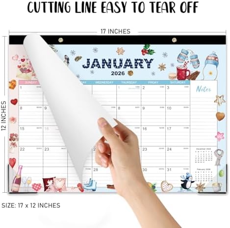 Cover 12 months from January 2026 to December 202617″ x 12″, Ideal for placement on your desk or hanging on the wallPerforated Page Line + Two Hanging Holes + Corner Protectors + Premium Thick PaperRuled Writing Block + Julian Date + Holiday Reminder + Reference Calendars + Notes Section12 different styles of theme, our 12-month desk calendar 2026 uses a unique theme design to bring you a different visual feast of the festival.