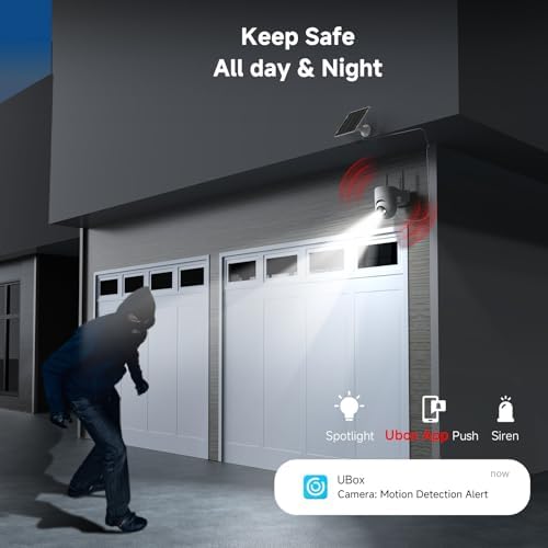 【Versatile Alarm Options & Real-Time Communication】 Benefit from 3 alarm modes – audio warning, spotlights, and Ubox App push notifications – to deter intruders effectively. Enjoy 2K color night vision for enhanced security, and utilize two-way audio to communicate with family, visitors or intruders in real-time