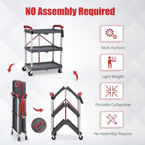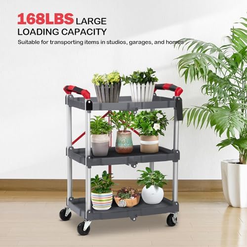【Multi-Scenario Flexible Application】This 3-tier foldable tool cart with wheels has plenty of storage space and is suitable for a variety of scenarios: office file organizing, warehouse cargo handling, outdoor party material transportation, or for storing production tools, gardening equipment and so on. It can also be used as a flower pot rack, tool storage rack, suitable for home, commercial and other diversified needs.