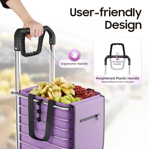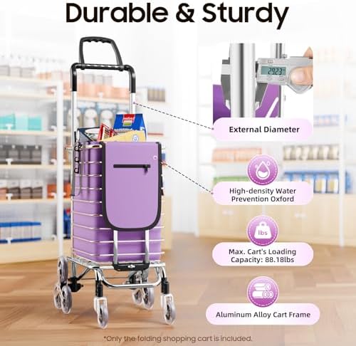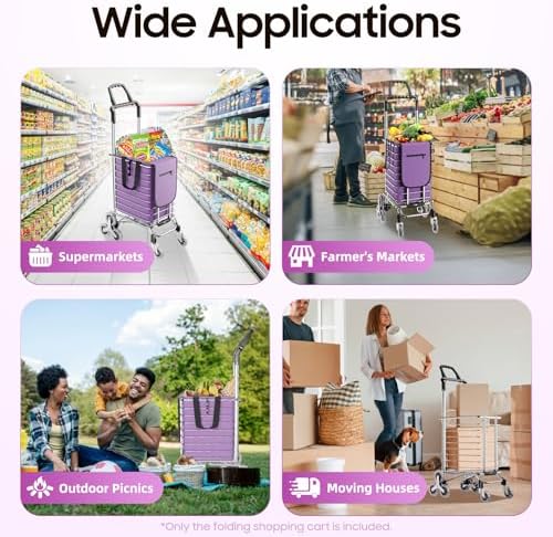 Large Capacity: The spacious basket (11.8112.5914.96 inches) and 9.24-gallon capacity purple shopping bag make this shopping cart with wheels suitable for loading fruits, vegetables, and daily supplies. Whether you’re going to the supermarket or a farmer’s market, this folding shopping cart can handle your family’s everyday or weekend shopping needs with ease.