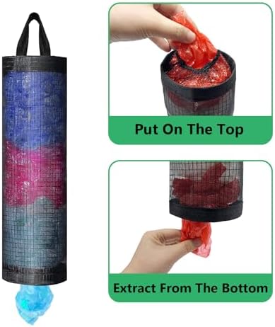 MESH HANGING STORAGE DISPENSER: Plastic bag organizer is with hanging design, it can be easily hung over the door, walls, cabinet or anywhere, saving your space and facilitating storage and use