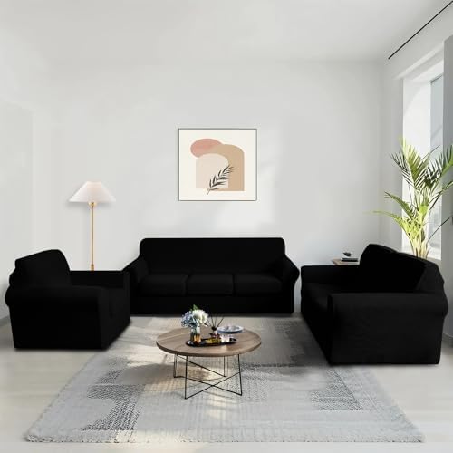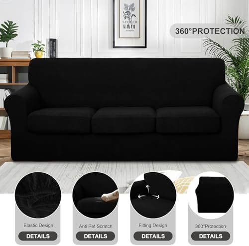 4 Pieces Stretch Couch Cover for 3 Cushion Furniture Protector Sofa Covers Washable Pet Dog Friendly Non Slip Cover with Elastic Bottom(72″-92″ Sofa 3 Cushion/Black)