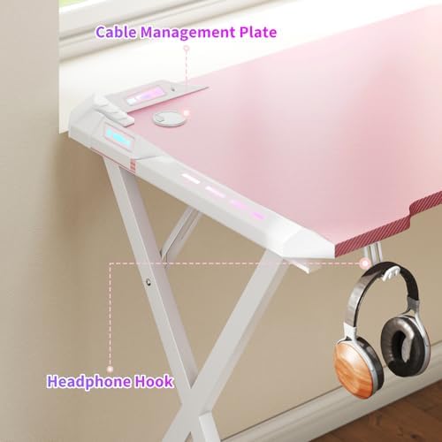 [47-inch Gaming Desk]: Enjoy our spacious 47-inch pink desk, featuring RGB lighting and a customizable LED system (over 100 color modes) that syncs with your music via the included remote control. Experience dynamic RGB lighting that pulses in rhythm with your music. The premium carbon fiber surface texture design enhances the desk’s aesthetic appeal and ensures optimal mouse control.
