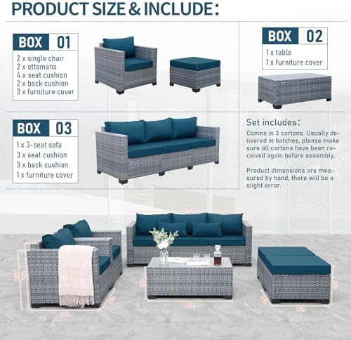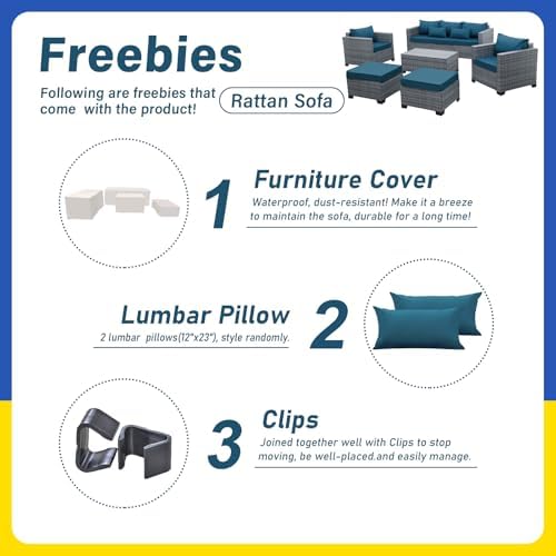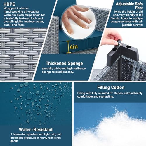 Comfortable and Non-slip: seat cushions(4 inches) with high resilience sponge and bottom array anti-slip dotted fabric, match up plump back cushions with water-resistant, color retention fabric covers for lasting appeal with outdoor patio furniture set; the sofa feet are designed twice as high as our original set, more user-friendly