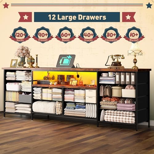 Spacious Drawers & Bedroom Essential:Measuring 63.1″W x 13.9″D x 29.6″H with 12 drawers in two sizes, this long dresser meets your need for sorting. In your bedroom, when accessories, and personal items are always in disarray, it’s your ultimate solution—offering ample space to neatly organize sweaters, jeans, and more. Ideal as a long dresser for bedroom, it transforms cluttered spaces into tidy retreats with effortless organization.