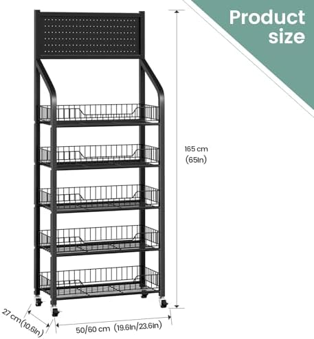 【Large Capacity with Smart Layout】 This 5-tier snack display rack measures 165 x 50 x 27 cm (65 x 19.7 x 10.6 in), offering generous vertical space while occupying only 0.16㎡. Each tier stands 10.6 inches apart, perfect for organizing snacks, fruits, vegetables, or tools. The added hooks provide extra space to hang bagged snacks or scattered items, making it an ideal chip rack for any retail or home setup.