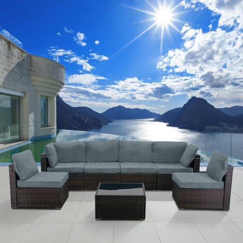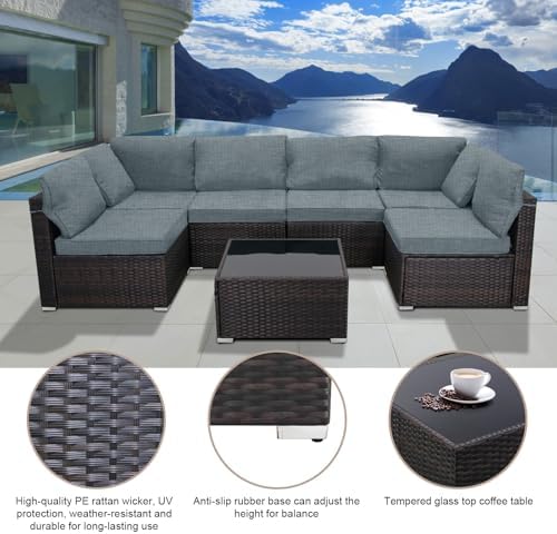 Flexible Combination:Patio set have many configuration options based on your preference and geography.Clips connect the sectional sofa,fastening strips and velcro tapes prevent cushions from sliding.L shape feet with adjustable screw adapt to variety of different terrains or adjust sofa height.