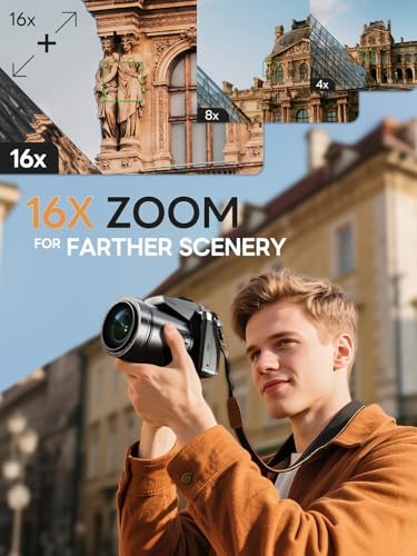 【16x Zoom & 180° Flip Screen】 This camera for photography can achieve smooth 16x digital zoom—perfect for travel, wildlife, and everyday photography. The convenient 2.8″ 180° flip LCD screen allows for real-time framing, and anti-shake technology eliminates image shaking, ensuring perfect selfies and Vlog recordings.