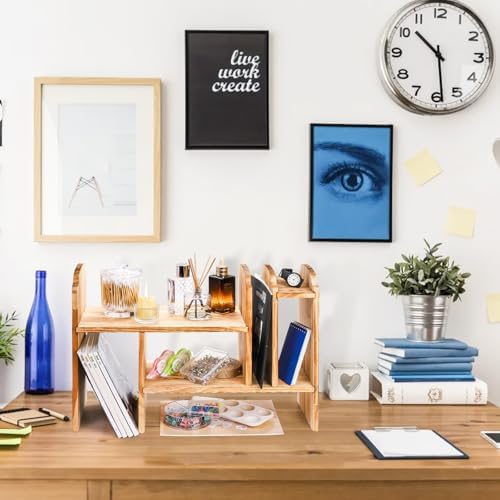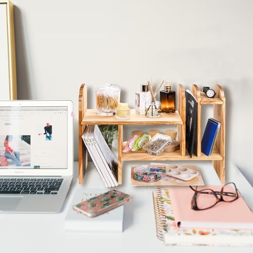 Expandable Desk Organizer: The desktop bookcase is composed of two main parts, which can be close to be a small shelf rack, or further apart to be a longer shelf, meets your different storage needs.