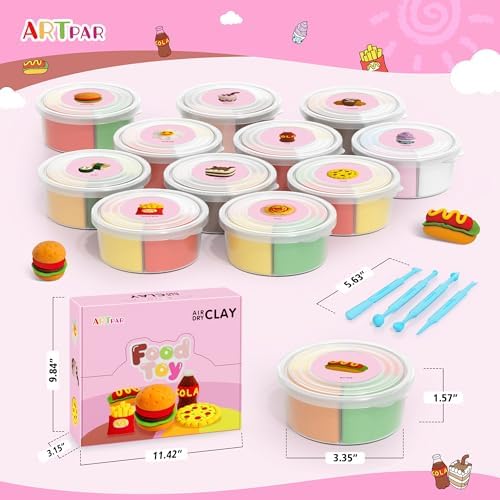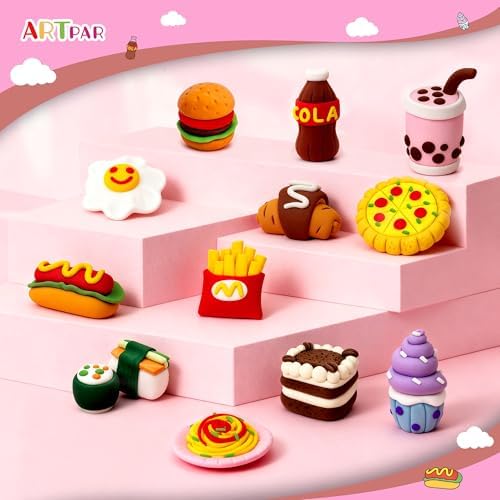 Artpar Air Dry Clay Mini Food Crafts Kits:Modeling Clay with 4 Sculpting Tools and Project Tutorials, the air dry clay set is packaged in 12 boxes, each jar has 4 small compartments filled with different colors of clay, 12 Fun Themed Food Designs – Create Pizza,Hamburger,Cola,Sushi,French Fries,Pasta with included step-by-step Cute Funny!