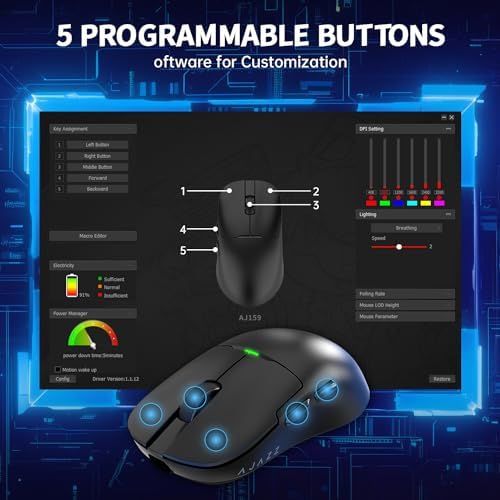 【56G ULTRA LIGHTWEIGHT & BATTERY SAVING ENGINEERING DESIGN】The AJ159 is designed and constructed with high-end ABS injection molded material, the mouse weighs only 56 grams with a rugged construction that provides faster and more precise movement. The built-in 400mAh lithium-ion battery can be easily recharged via Type-C cable for uninterrupted use, ensuring long battery life during gaming. The mouse enters power-saving hibernation state after stopping moving for 10 seconds, and moving/pressing the button wakes up the mouse, and the mouse stops moving for 5 minutes and enters deep hibernation state, and pressing the button wakes it up. Don’t worry about the short battery life of the mouse