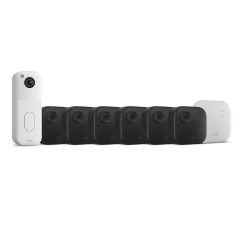 Includes one Blink Video Doorbell, six Outdoor 4 cameras, one Sync Module XR, 15 AA Energizer lithium batteries, mounting kits for each device, a wall plate, a doorbell removal tool, wire extenders, a USB-C cable and power cord.