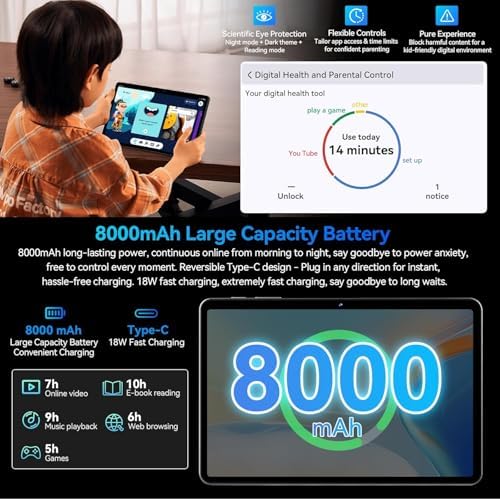 【Long-lasting battery life】This gaming tablet features a large 8000mAh battery, which effectively reduces battery anxiety. Experimentally tested, it can standby for more than 800 hours and you can freely enjoy 8-10 hours of reading or video watching on a full charge. With Type-C charging, it provides quick and reliable power replenishment, keeping you connected and entertained on the go.making it a reliable tablets for adults for travel, work, or binge-watching sessions.