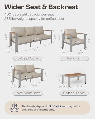The armchair supports up to 400 lbs, the love seat sofa up to 800 lbs, and the 3-seat sofa up to 1200 lbs. The coffee table holds up to 265 lbs. With its all-aluminum frame and precise engineering, the welding ensures durability and reliability.