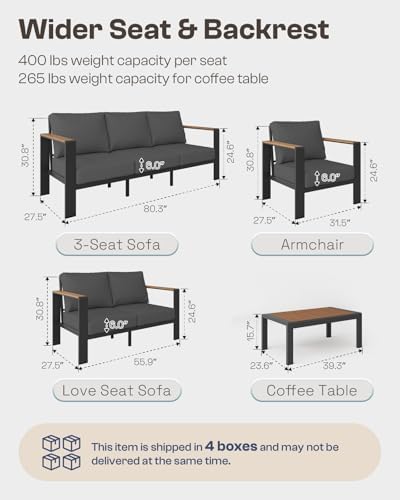The armchair supports up to 400 lbs, the love seat sofa up to 800 lbs, and the 3-seat sofa up to 1200 lbs. The coffee table holds up to 265 lbs. With its all-aluminum frame and precise engineering, the welding ensures durability and reliability.