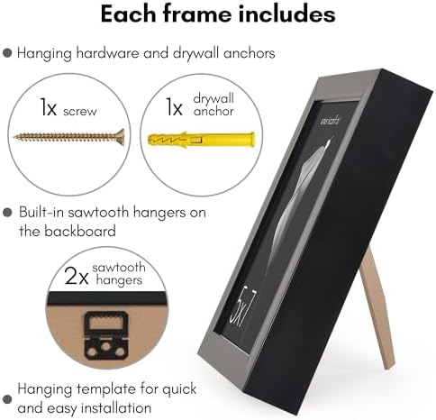 Give your memories the frame they deserve with our Americanflat 5×7 picture frame, designed to elevate every moment. Crafted from durable engineered wood-plastic composite with premium, deep molding, this is more than just a picture frame; it’s a game-changer for your decor. The shatter-resistant glass front offers a crystal-clear view while protecting your photos, posters, or artwork from dust and scratches. Because your favorite moments deserve nothing less than perfection. Versatility meets style with these gallery-style frames. Hang it vertically or horizontally using the included hanging hardware, or use the easel stand for a tabletop display. It’s an ideal way to showcase your cherished photos anywhere in your home or office. No matter how you style it, the black finish adds a timeless touch, instantly elevating your space. Refreshing your display has never been easier. The easy-to-use metal tab closures make swapping photos a breeze, so you can update your walls as often as you like. Plus, the sturdy backboard keeps everything securely in place, ensuring your memories always look their best. Why settle for boring walls when you can have a gallery at home? This photo frame is built to last, combining style and functionality to create keepsakes you’ll treasure forever. Order yours today and join thousands of satisfied customers who’ve transformed their spaces with Americanflat.