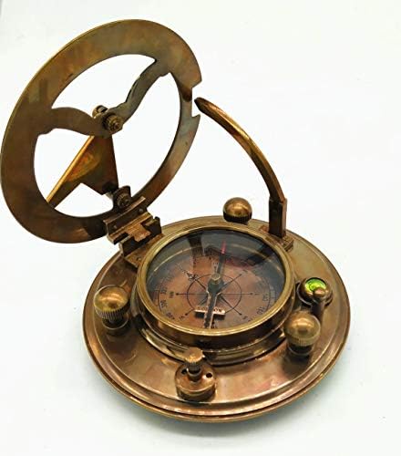 Brass Sundial Compass with Chain & Leather Case The Sundial is made of Premium Grade Brass and the Sun Dial comes with a gift box, made of Leather; box beautiful by itself. Dimension : Diameter : 3 Inches approx. ; Weight : 0.32 kg Push Button Brass Sundial Compass In Polish Brass Finish The compass as well as the sundial are functional. It can be used for basic measurements. Great Gift For Maritime, Nautical, Hiking and outdoor enthusiast. Handmade replica, not sold as antique. A free brass key ring is sent along as a gift Made in India by highly skilled craftsmen.