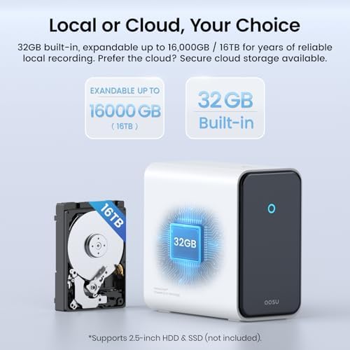 Built-in Local Storage — Secure & Expandable: aosu features 32GB of built-in storage (expandable up to 16TB), keeping your recordings private, encrypted, and fully under your control.
