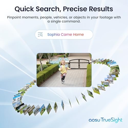 aosu TrueSight — When Your Camera Truly Understands: TrueSight AI combines face recognition and behavior analysis to detect strangers—even in disguise—and recognize both familiar and unfamiliar vehicles. Suspicious behavior triggers instant alerts, while footage is AI-organized for quick, one-command searches—keeping you proactive and your home safer.