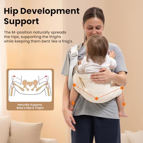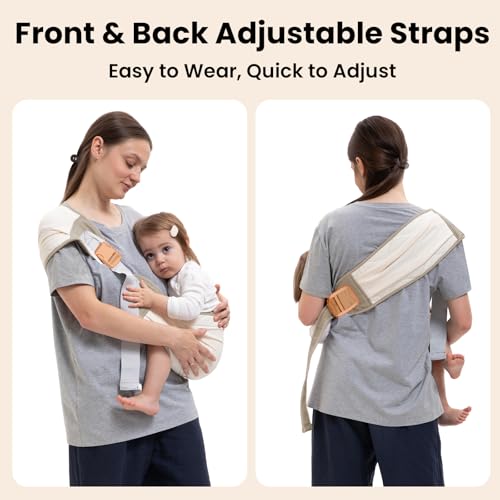 【Adjustable & Ergonomic Fit】This toddler sling carrier features dual front and back adjustable straps, offering a perfect fit for all body types, including plus-size parents. Its ergonomic M-shaped seat supports healthy hip development, making it ideal for long-term use from newborn to toddler.