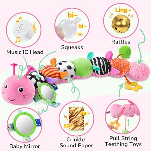 【Scientifically Designed Tummy Time Toys】Featuring vibrant patterns,mirrors,and pull strings,this stuffed animals pique baby’s curiosity,keeping their attention for extended periods.Aiding in head lifting,preventing flat head syndrome, promoting muscle development,preparing for crawling,enhancing coordination,hand-eye coordination and grip strength.Ideal for baby toys 0-6 months,subtly improving skills during play