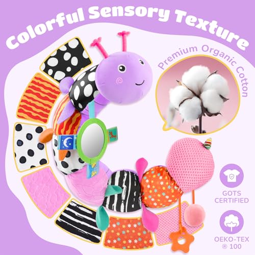 【Multi-Colored Interactive Sensory Toy】AWOTOY baby musical toy features 6 different patterns along its body,emitting 4 types of sounds(a music IC button hidden in head,a squeaker in first body segment,crinkle sound paper in others,and a rattle at the end).These features help soothe babies during fussiness or travel,alleviating restlessness.The gentle sound&tactile design aid in healthy sensory development.An outstanding multi-sensory toy for baby girls and boys 0-6-12 months.