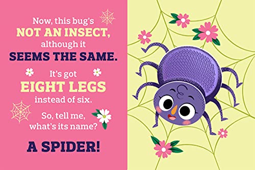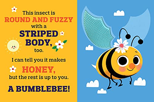 A different touch and feel silicone element is on the cover and each spreadQuestion and answer book featuring fun facts about bugs found in your own backyardAdorable illustrations of a caterpillar, butterfly, lightning bug, bumblebee, snail and spiderInteractive fun and tactile learning in this children’s book will engage young readersToddlers will enjoy the different touch and feel elements and bright, colorful illustrationsAdd a new baby book to a child’s library today!