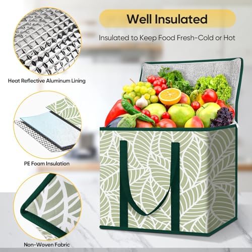 [EXTRA LARGE & STURDY] Spacious box shaped insulated grocery bags provide ample shopping space. Reinforced stitches in the bottom keeps the reusable grocery bags up for easy loading and unloading. Strong and extra-long handles fit tall items and allow shoulder carrying.