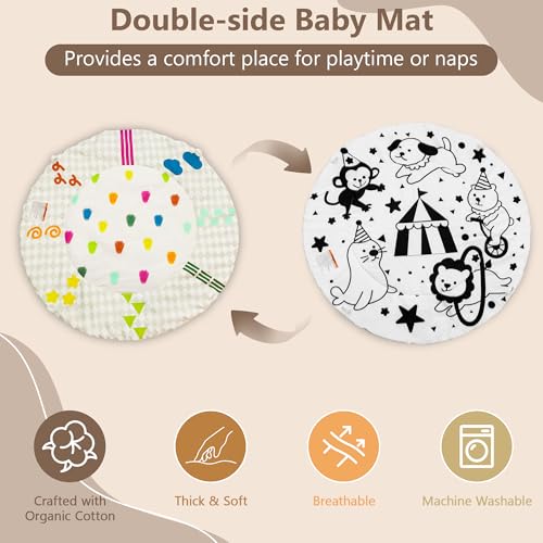 Double-Sided Baby Activity Mat: This tummy time mat offers two developmentally designed surfaces. One side features a newborn-friendly, high-contrast black-and-white circus scene to captivate and stimulate early vision. The other side bursts with vibrant colors and shapes for growing visual interest. Made with soft material, it creates a cozy space for sensory exploration and learning at every stage