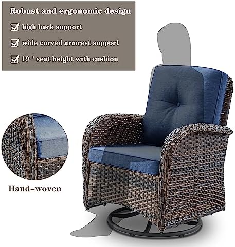 2.Multifunctional Patio Swivel Chair: The base of the swivel chair has the dual function of 367 ° rotation and glide back and forth, and also has a soft cushion, large size, deep seat, high backrest, wide armrests, hand-woven and many other advantages, compared to other types of patio chairs it can bring your family and friends more comfortable leisure experience.