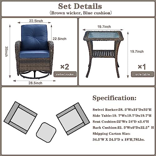 1. Wicker Patio Set Details: The set includes 2 wicker swivel rocking chairs and 1 glass top side table, each chair has a weight capacity of 300 pounds and the side table has a weight capacity of 50 pounds. The natural color wicker with beige cushions in a simple and premium tone is perfect for decorating your patio, porch, balcony, sunroom and other outdoor spaces.