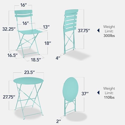 COMFORTABLE SEATING FOR 2: Designed to comfortably seat two people for cozy meals or casual conversations without taking up too much space; TABLE DIMENSIONS: 23.5″(Dia) x 27.75″(H); CHAIR DIMENSIONS: 18.5″(L) x 16.5″(W) x 32.25″(H); TABLE CAPACITY: 110 lbs.; CHAIR CAPACITY: 300 lbs.