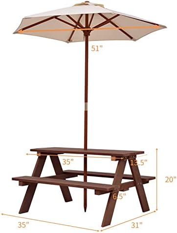 This outdoor kids picnic table is an ideal gift for your little kids! Our table and bench set have enough space to accommodate up to 2-4 children at same time, which will provide a roomy place for kids to eat and play. Made of premium fir wood, this outdoor children activity furniture is sturdy and stable, with a light solid wood fragrance. In addition, the round corners of the playful picnic table can protect the children well. This kids party table set also comes with a removable and foldable umbrella that can keep kids safe from the sun and rain. It is perfect to be used as a game table, picnic table or study table in the backyard, patio, lawn, garden, and indoors!