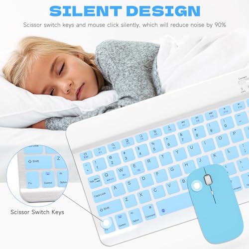 Comfortable Bluetooth Keyboard: The keyboard is US QWERTY layout, which can provide a comfortable, responsive typing experience, effectively improve your work efficiency. It is easy to use, has hot keys, such as volume control, play and pause, previous and next etc. and Silent mouse click reduces noise and will not interfere with your work environment.