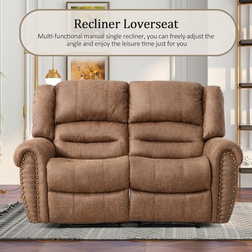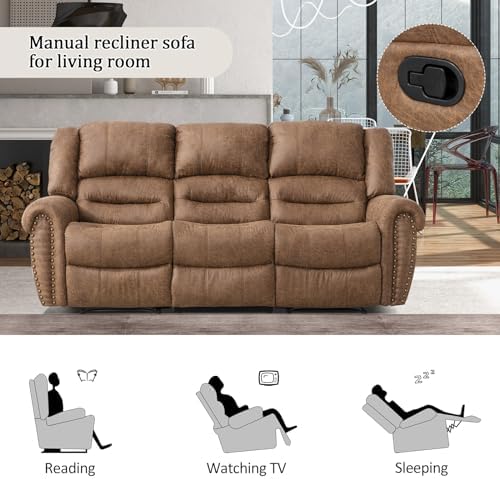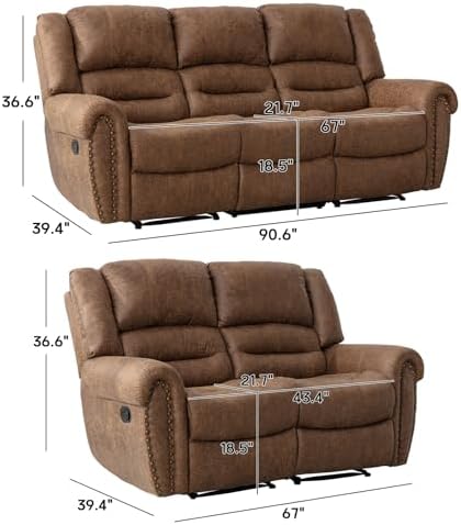 MANUAL RECLINING SOFA SET:This manual reclining sofa set including one manual recliner loveseat, one 3-seater reclining sofa and one single recliner chair.The Vintage rivets design, overstuffed armrest and high backrest create a classic and traditional look that’s perfect for modern style homes. Comfortable padding, excellent lumbar support and a fully upholstered seat allow you to enjoy your rest time.