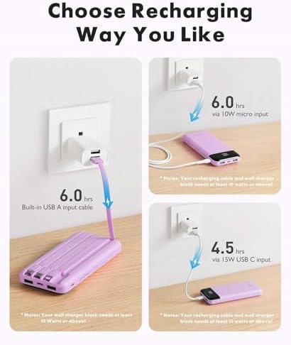 🔋【6 Outputs and 3 Inputs】Portable charger has 6 outputs and 3 inputs, you may charge 6 devices max at the same time, recharge battery pack with 3 options easily. Portable charger builts in 3 output cables and another 3 outputs (Total 6 outputs), great for multi electronics users who has iPhone, android or micro devices. It also builts in 3 inputs (1 built-in recharging cord/cable, 1 usb c input, 1 micro input), which you can use any one of them to recharge battery pack conveniently.