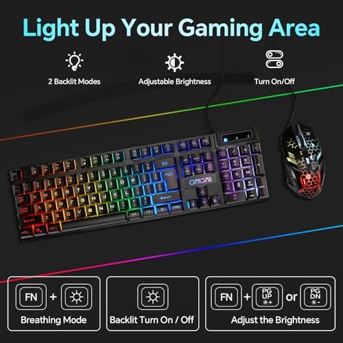 【RGB Rainbow Backlit Gaming Keyboard and Mouse】The keyboard mouse combo is rainbow backlit keyboard and RGB breathable backlit mouse, you can customize the keyboard backlight/brightness. The glitter keyboard offers 2 illumination modes and 3 brightness levels to choose from. FN+PgUp/PgDn: Backlight brightness and speed adjustment; Fn+sunkey: Adjust the backlight mode (Constant Light/Breathing), can be turned off if not needed.The full 104 keys keyboard has rgb backlit function and all letters glow and never easy to fade