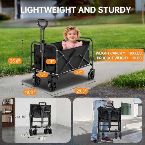 Spacious 120L Wagon: Built around a sturdy steel frame, this collapsible wagon (29.5″L x 18.1″W x 35″H) effortlessly transports luggage, gardening tools, camping gear, and other heavy items. Sets up in minutes into a spacious hauler ready to tackle your toughest jobs with rugged durability