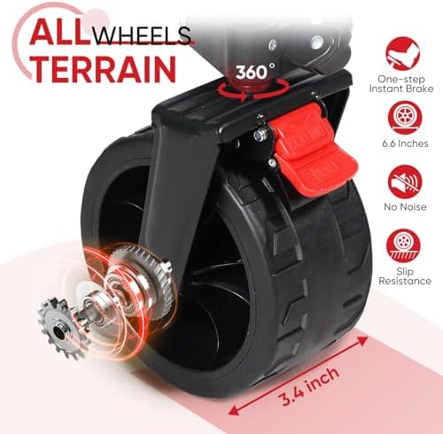 𝗔𝗹𝗹-𝗧𝗲𝗿𝗿𝗮𝗶𝗻 𝗕𝗶𝗴 𝗪𝗵𝗲𝗲𝗹𝘀: 𝟲.𝟲” heavy-duty wheels tackle any terrain—ideal for sand, rocks, grass, and mud! Built-in bearings ensure a 𝗾𝘂𝗶𝗲𝘁 𝗿𝗶𝗱𝗲, and the 𝘀𝘁𝗲𝗽-𝗯𝗿𝗮𝗸𝗲 system gives you instant stopping power.