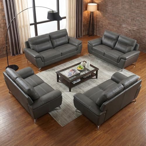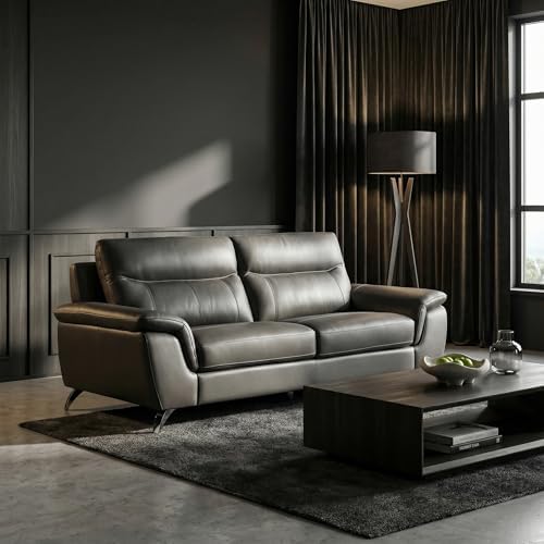 The Cortesi Home Chicago sofa is designed for durability and comfort, without compromising on style. It features pillow back cushions that offers excellent lumbar support. Perfected with flared arms and turned chrome finish legs gives this sofa a sleek and modern appeal. It has top grain leather with a leather match on the back and bottom sides. This piece comes with additional optional support legs for those requiring a heavier use. Thanks to the deep grey color the Chicago sofa blends in seamlessly with almost all home decors. This beautiful piece requires some assembly upon arrival. A matching 2 seater loveseat is also available.