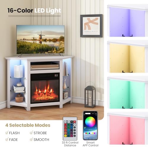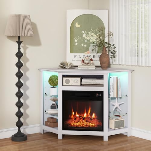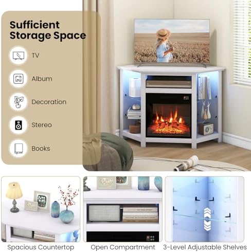 [TV Stand & Fireplace Combo] This corner TV stand comes with an electric fireplace, perfectly satisfies your multiple demands.The retro appearance and wood-like surface with the vivid flame effect and LED brightness add beauty to your living space.And the unique shape of the TV stand fits every corner of your room well.