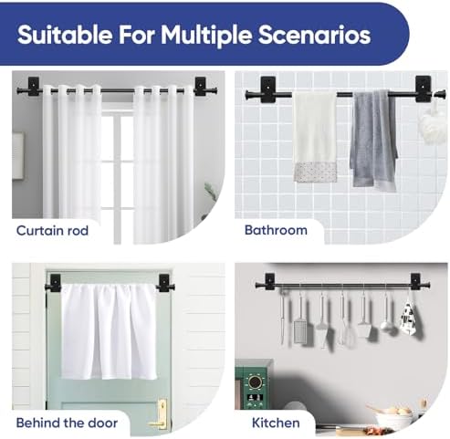 【Matters Needing Attention】1. Pay attention to wall suitability. No drill for smooth surface such as glass,door back, ceramic tiles, marble, and stainless steel;Dill for rough drywall, cement walls, painted walls.2.Pay attention to load bearing. This curtain rod is only suitable for light curtains. It can hold up to 16 pounds without drilling.