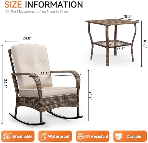 【EASY TO CLEAN】Keep your outdoor rocking chair set looking brand new with easy cleaning. The removable seat cushions are machine washable and the smooth rattan surfaces can be quickly wiped clean with a damp cloth to banish dust or spills. The corrosion-resistant metal frame remains durable through every season, requiring no tedious extra upkeep.