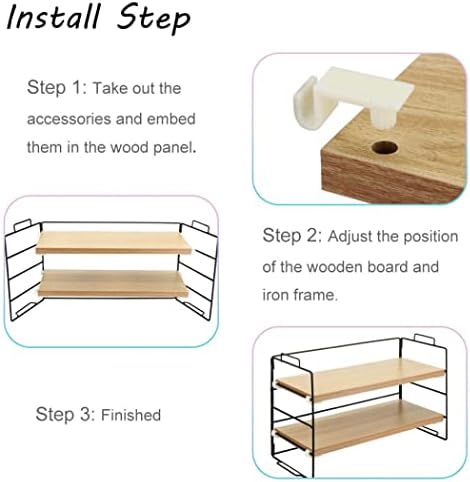 Waterproof & Durable: The small bookshelf organizer is made of premium wood, flat and smooth surface can efficiently resist the corruption from water and easy to be cleaned.Sturdy Structure Design: Sturdy wooden planks and heavy metal bracket makes it strong and durable enough to stand up to daily use in your kitchen, bathroom or office.Adjustable Board Distance: you can adjust the upper and lower display space according to your usage habits.