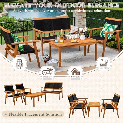 Breathable Weaving Rope: The open-weave rope design of our patio conversation set promotes optimal airflow circulation. This natural breathability helps maintain seating comfort even during extended use in hot weather, while effectively minimizing the moisture retention.