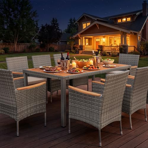 Devoko Outdoor Patio Dining Sets 9 Pieces Wicker Outdoor Dining Table and Chairs Set with Acacia Wood Table Top and Widened Armrests for Backyard, Garden, Deck (Grey)